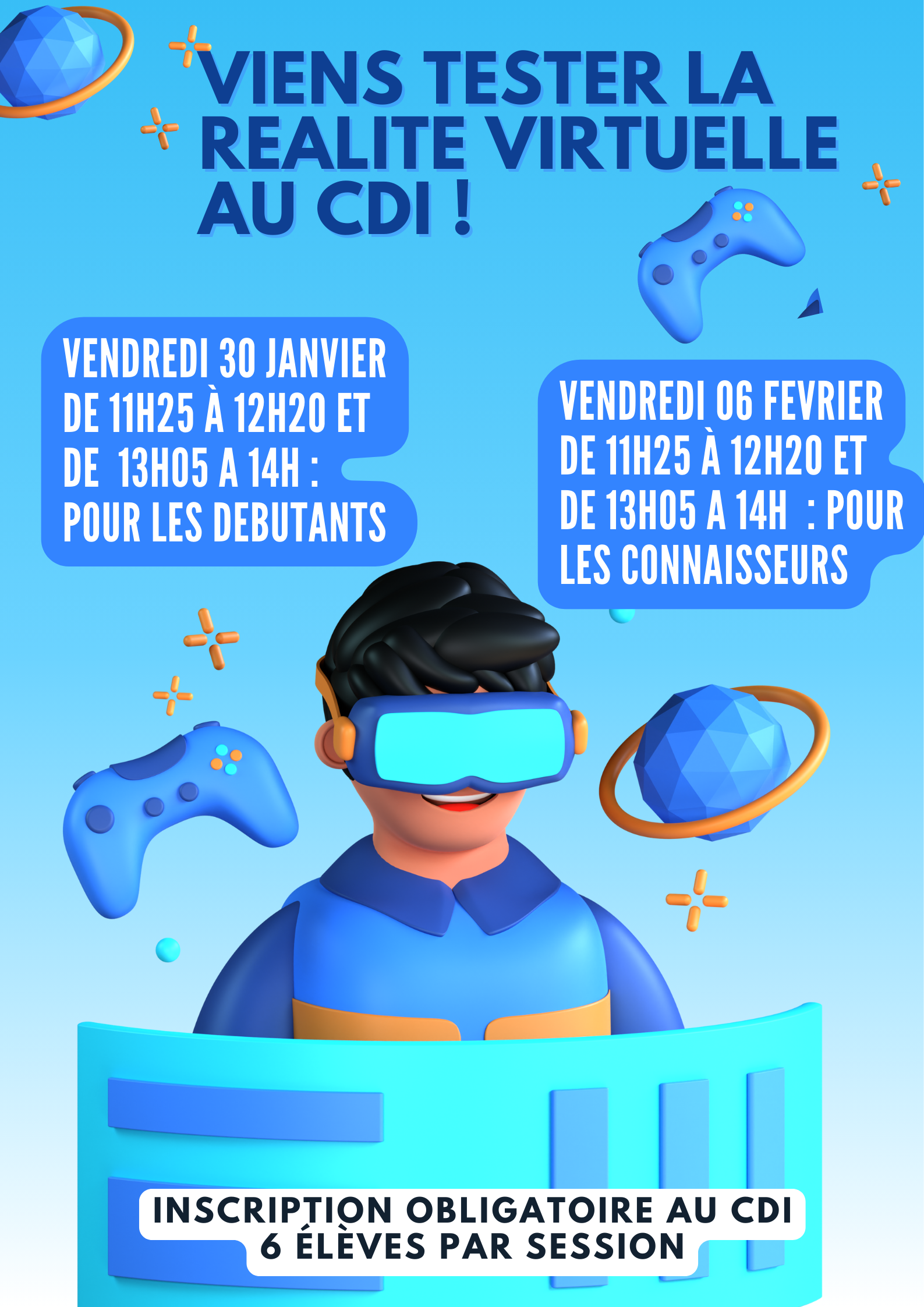 De nouvelles sessions de réalité virtuelle sont ouvertes au CDI. Avec cette fois-ci, des séances pour les débutants et d'autres pour les élèves ayant déjà testé. Inscription obligatoire au CDI.