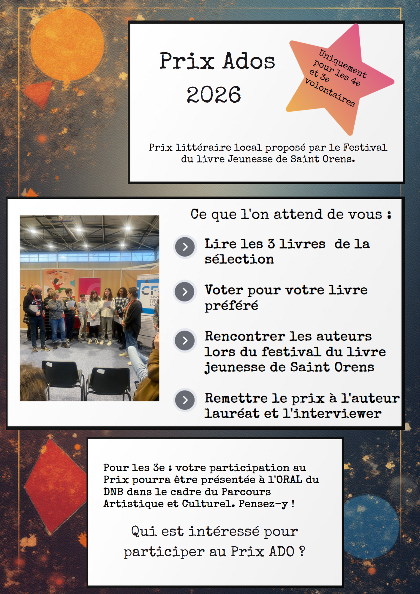 Tu es élève en 4e ou 3e ? Tu souhaites participer à un prix littéraire, voter pour ton livre préféré et rencontrer son auteur ? Alors le Prix Ados 2026 est fait pour toi.