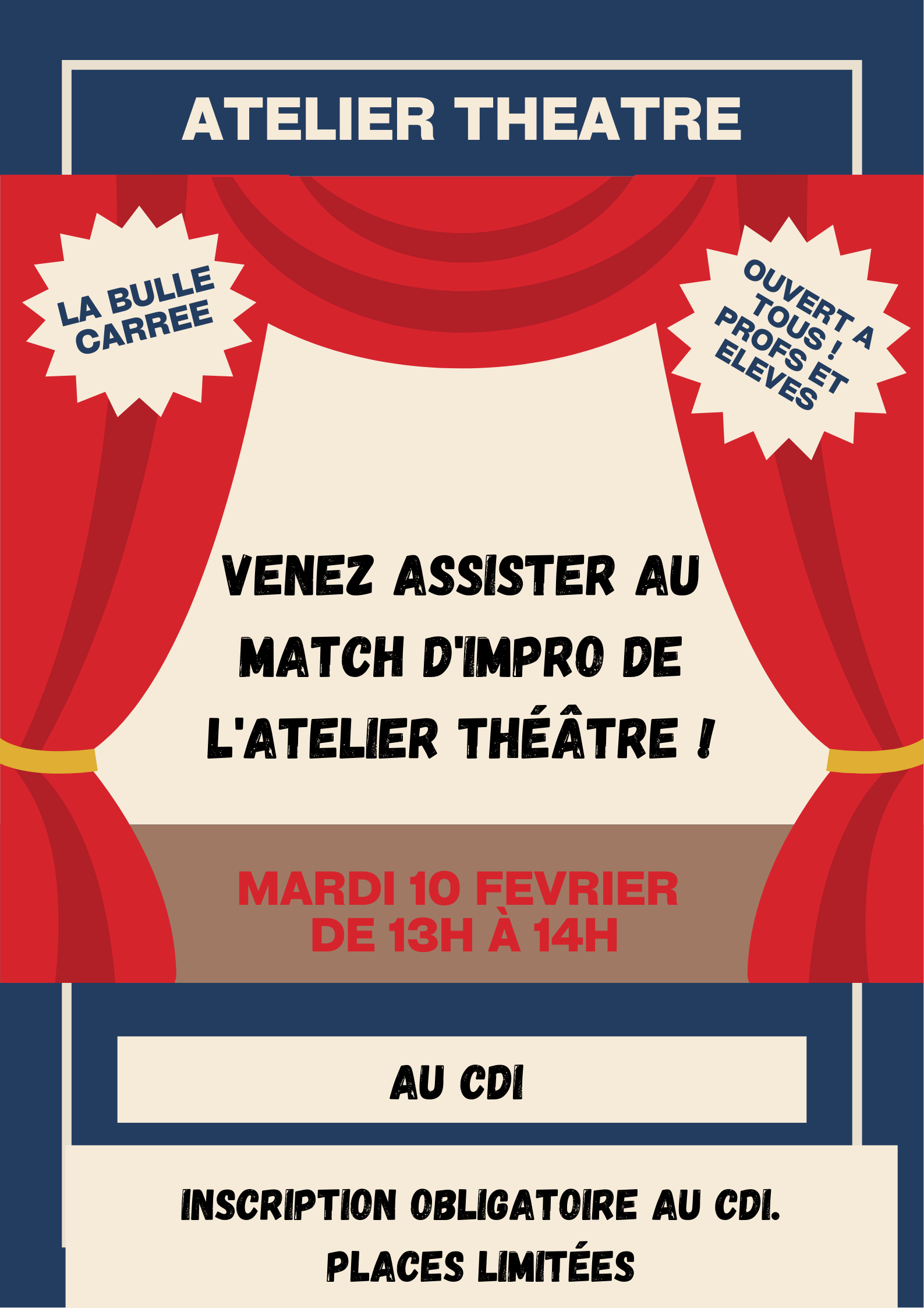 Les élèves de l'atelier théâtre d'impro vont se produire sur scène pour leur premier Match Intra Collège. Vous pouvez venir les encourager ! C'est ouvert à tous dans la limite des places disponibles.